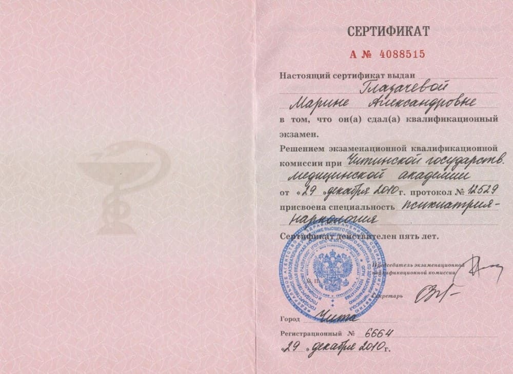 Психиатр-нарколог. Стаж 12 лет. Окончила Читинскую Медицинскую Академию в 2009, прошла интернатуру по психиатрии, специализацию по наркологии. Начала свою врачебную деятельность в 2010 году.